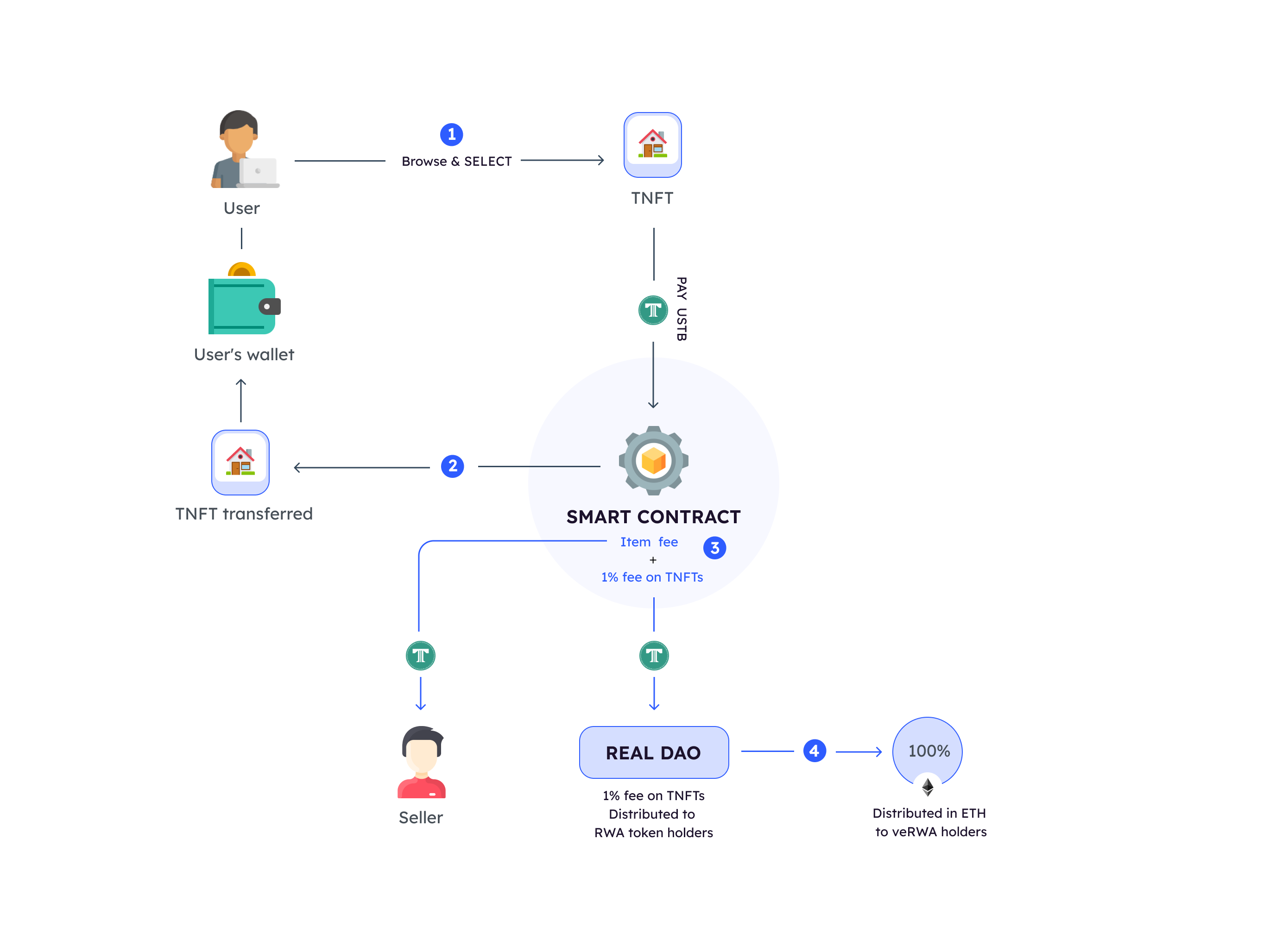 3. Concurrently, USTB tokens are sent from the Buyer’s wallet to the Seller’s wallet. Smart contracts process the trading fee, item purchase fee, and storage fee (relevant to assets like gold.) Physical items remain in storage unless the Buyer decides to redeem it.&#x20;